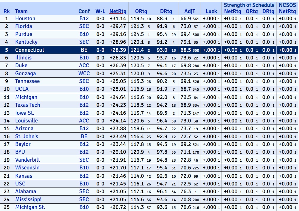 The posting of these preseason bellweathers, which coincides around the start of secret scrimmage and exhibition season, has become something of an informal start to the college basketball calendar. UConn playing its first exhibition on the same day is a coincidence, but also telling. Basketball is here. UConn debuted at #5 in KenPom’s preseason projections, and also #5 in the H.U.M.A.N. poll. They were picked 4th in today’s preseason AP Poll.