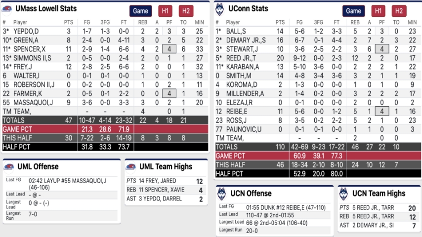 HARTFORD – UConn men’s basketball tore through its second opponent of the season, devastating UMass Lowell, 110-47, as Tarris Reed Jr. made an immediate impact in his season debut, scoring 20 points and grabbing 12 boards in just 17 minutes.