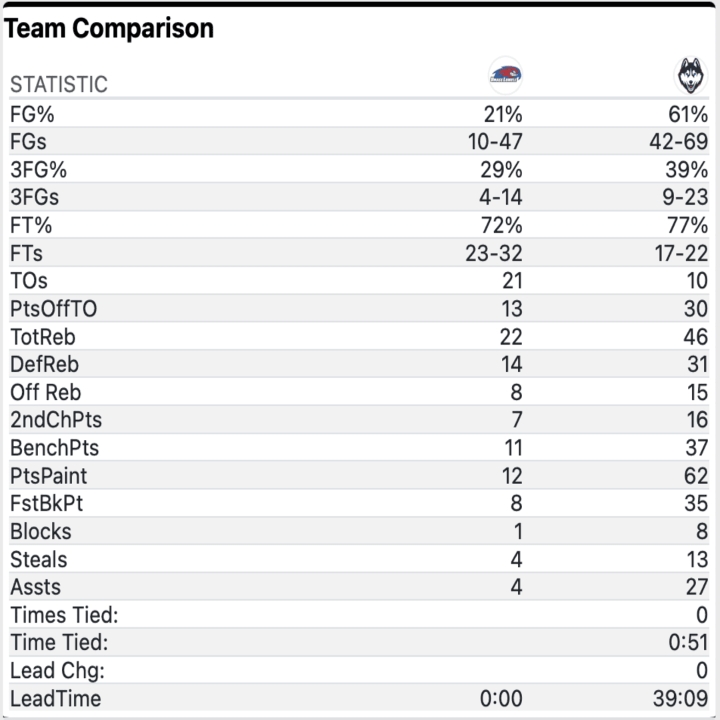 Seven Huskies finished in double-digit scoring as they hit 61 percent of their shots on the night, notching 27 assists on 42 field goals. UConn dominated the glass and scored 30 points off turnovers and 62 points in the paint.