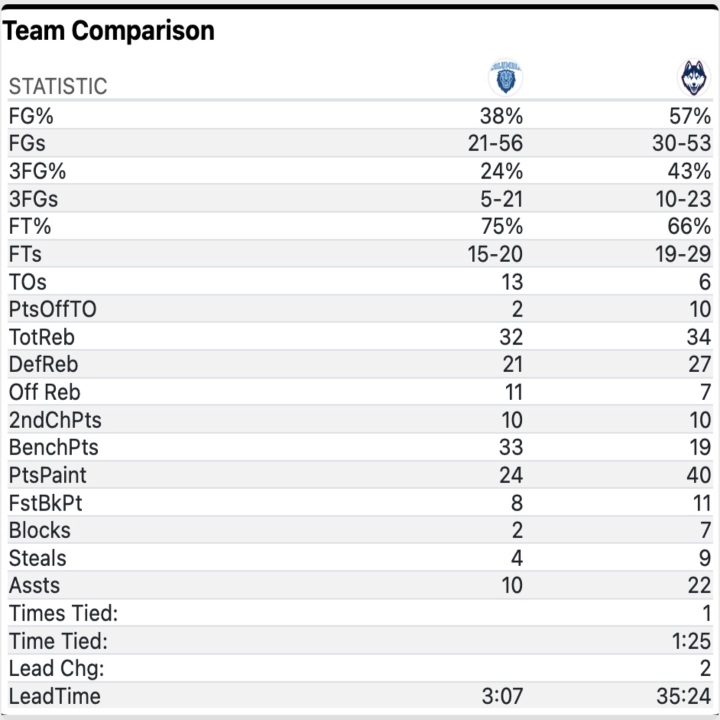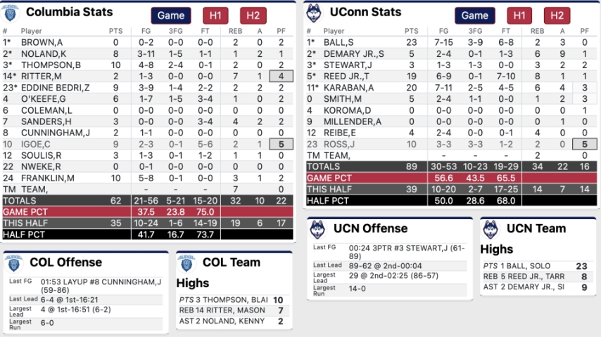 After a Karaban three, Ross hit another three, and Ball hit another triple before a Karaban dunk-and-steal made it 41-17 with 3:35 left. Karaban, Ross, and Ball were in double figures at halftime as the Huskies led 50-27 at the break.