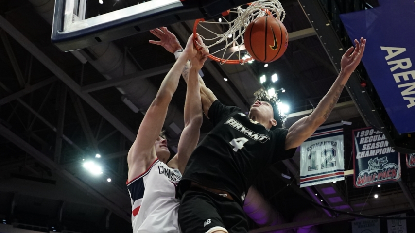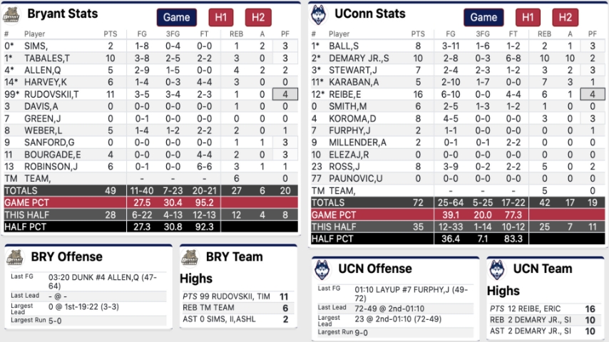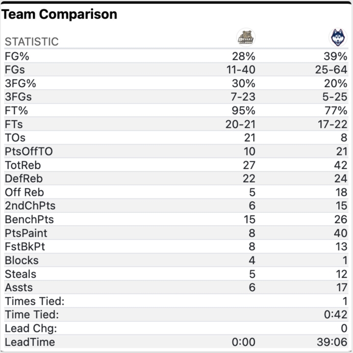 Jaylin Stewart knocked down a corner three-pointer to start the game and, though Bryant fought hard in the early minutes, UConn was up 15-5 in the middle of the first half. A 14-2 run pushed the lead to 20 as the Bulldogs began turning it over a lot; they finished with 21 giveaways on the night.