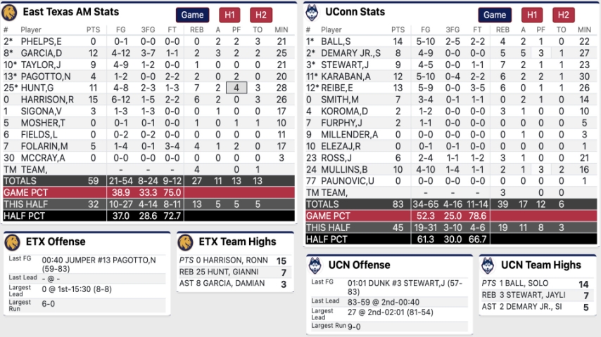 Though it got as big as 14 points in the first 20 minutes, UConn took a healthy 38-27 lead into halftime as Malachi Smith gave them a spark off the bench and every starter was on the board with at least four points. The visitors stayed in the game thanks to some great shotmaking, as their looks were not so great throughout the night.