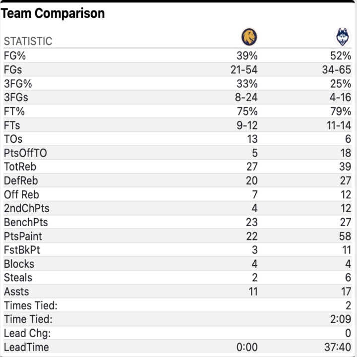 The Huskies finished with four players in double digits and four guys with 6+ points each, led by 14 from Solo Ball, 13 from Eric Reibe, and 12 from Alex Karaban. They were getting whatever look they wanted offensively, especially in the paint, and controlled the glass as well. Ball and Reibe both had big second halves.