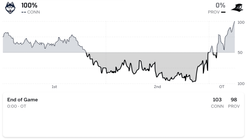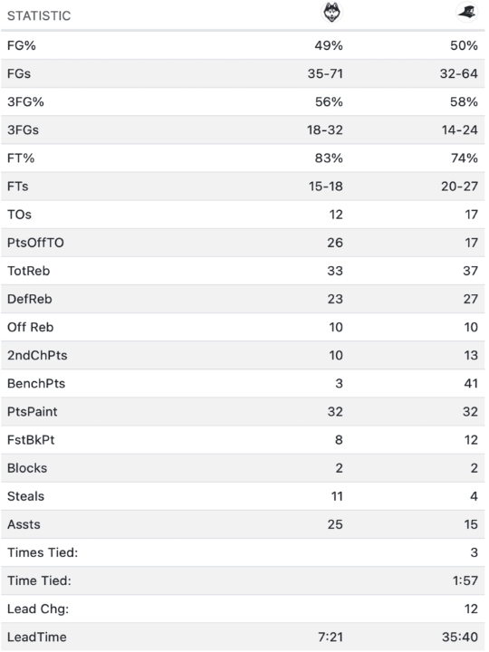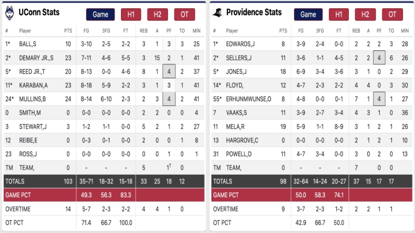 The Friars went on a 21-4 run late in the first half to take an early 13-point lead, but the Huskies closed out regulation on a 14-3 run before eight points from Braylon Mullins in overtime helped seal the deal.