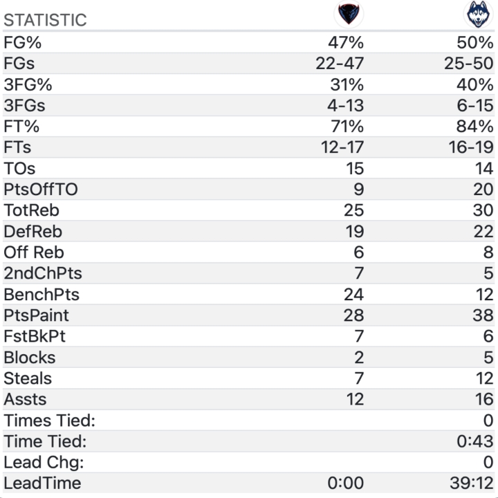 Braylon Mullins was the centerpiece of the UConn offense, scoring a team-high 16 points. Alex Karaban dropped 15 while  Silas Demary Jr. addeded with 14, his third straight game in double figures.