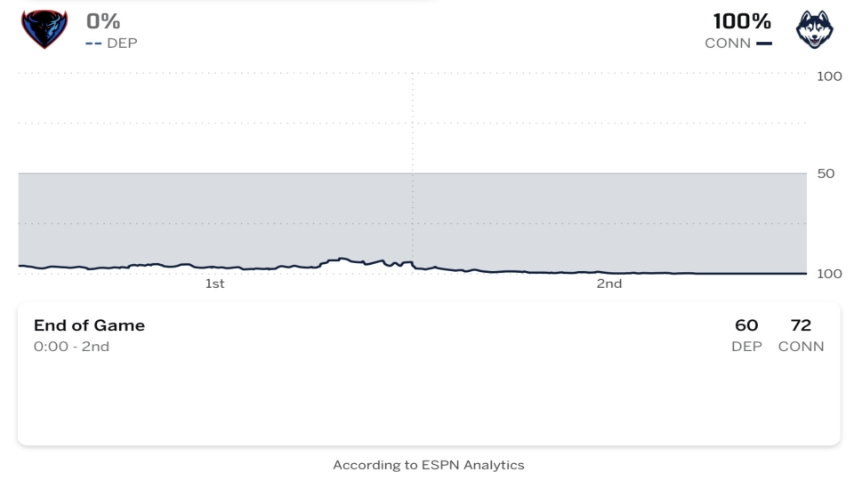 The Blue Demons started 3-of-15 from the field with four turnovers in the first 13 minutes, settling for tough looks deep in the shot clock. UConn built a 21-11 lead at that point.