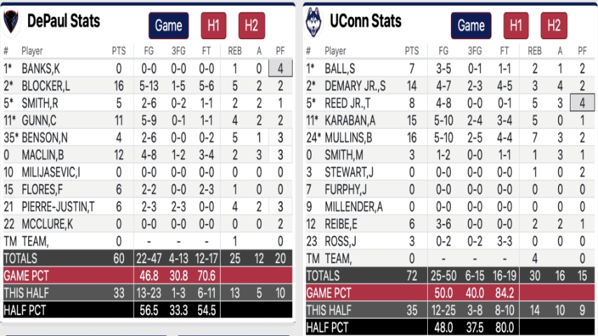 On the first possession of the second half, Karaban picked up a steal and connected with Demary on a give-and-go for what looked like a three-point play thanks to a goaltending call, but a successful Blue Demon challenge negated the bucket. The Husky captain still knocked down a pair at the line to increase the lead to 39-27.