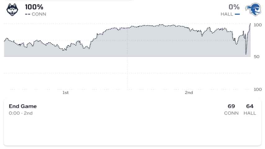 UConn led by 13 at halftime and 18 in the second half before the lead dwindled down to one with 48 seconds left after the home team hit its first three-pointer of the evening.