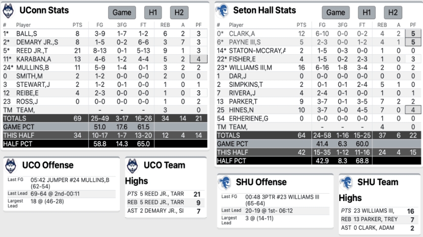 The Huskies stayed in the game early thanks to offensive rebounds and some early playmaking from Reed and Karaban. UConn had 11 offensive boards that resulted in 12 second-chance points in the first 20 minutes, headlined by a putback slam from Karaban.