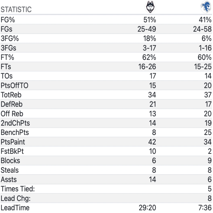 The lead peaked at 18 with those free throws at the 14:48 mark. After that, the Pirates began to press and it worked, forcing turnovers and overall sloppiness from the Huskies that got the game back within single digits by the 10-minute mark.