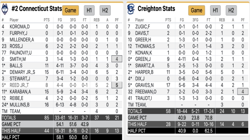 Creighton hit some timely shots to stay in it early for the sold-out crowd, like the Jasen Green three that tied it at 22. Karaban drilled the Huskies’ sixth three-pointer of the half to put UConn back in front with seven minutes remaining.