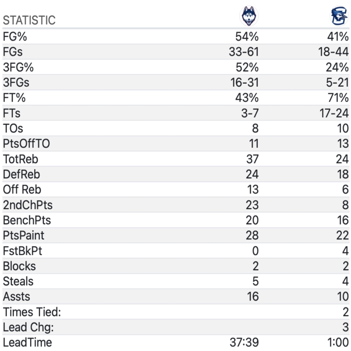 UConn finished a blistering 16-31 (52%) while Creighton shot just 5-21 (24%). The Huskies dominated on the glass 37-24 and in the assist column 16-10. After the score was tied at 27, UConn closed on a 58-31 run over the final 24 minutes or so.