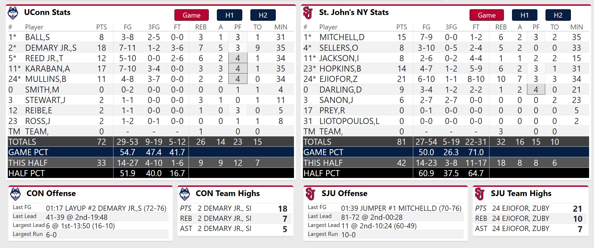 Karaban helped the Huskies stay in the game with a nice rebound and putback to make it 69-67. But a Darling three and a Demary giveaway followed by an Ejiofor floater put St. John’s up 74-67 with 2:27 left.