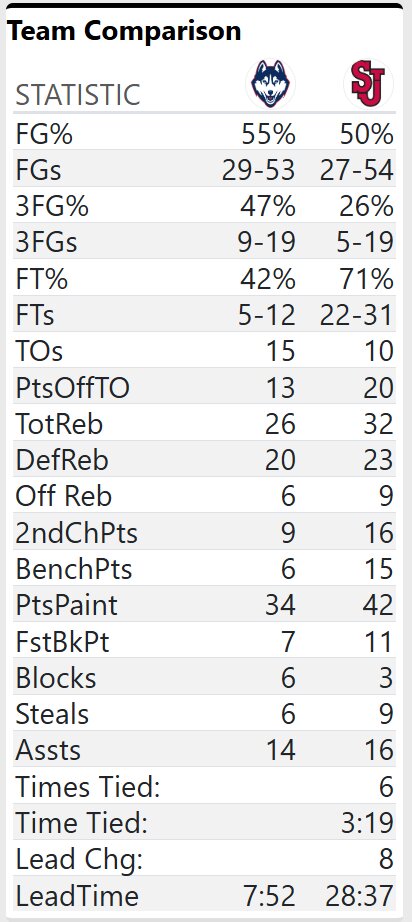 The first half was an instant classic, featuring four ties and six lead changes before ending tied at 39. No. 3 UConn (22-2, 12-1 Big East) shot 55% from the field and 9-of-19 (47%) from three, but turned the ball over 15 times and let the game slip away down the stretch.