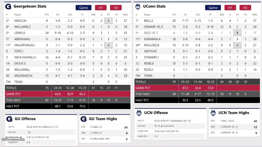 With the score tied, the Huskies turned the ball over to create a fastbreak opportunity for the Hoyas, but a great defensive stand from Karaban shifted the momentum and set Ball up for a transition three to put UConn back in front 28-25.