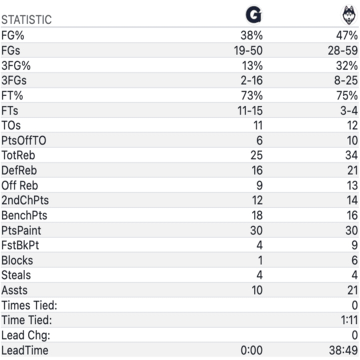 UConn (29-4, 17-3) controlled the glass throughout and notched an assist on 21 of 28 field goals. Tarris Reed Jr. tied a career high with seven assists, finding cutting teammates from the top of the key all night long. On the defensive end, they forced the Hoyas to shoot just 2-16 from three (13%).