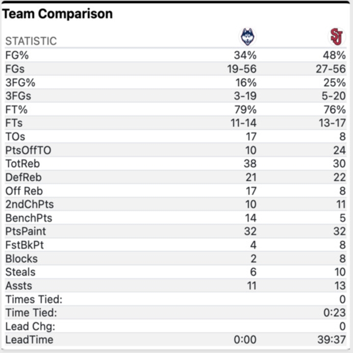 The Red Storm controlled the game from the opening tip, scoring the game’s first 10 points. The Huskies never led a single second in the loss and shot 34 percent from the floor as a team and 16 percent (3-of-19) from three while turning the ball over 17 times.
