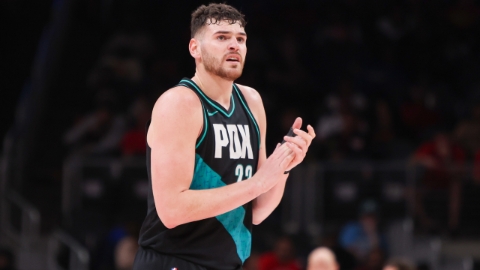 Donovan Clingan has been making Blazers fans happy that they drafted him with the 7th overall pick. So far he’s demonstrated his defensive prowess and playmaking ability, with 13 rebounds and five blocks in his first game Saturday night followed by eight points, 11 rebounds, five assists, three blocks, and this tremendous slam in his second game Monday night against the 76ers.